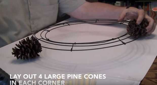 Empezar por los bancos en la parte posterior de la estructura de alambre y pegar 4 conos de pino en las "esquinas".