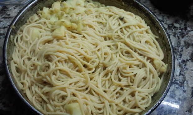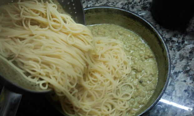 Tiempo: 25 minutosNecesidad de:Recipiente pequeño de Ricotta1 lb de Pasta-espaguetis1 bolsa pequeña de arvejas o guisantes frescos1 cucharada de aceite de oliva1/2 diente de ajo picadoQueso parmesanoPaso 1: Cook Colocar una olla grande de agua en la