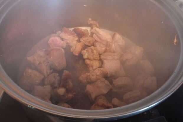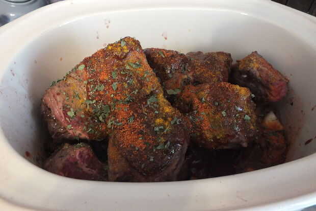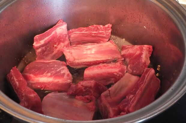 En una sartén de tamaño Med precalentado marrón la carne en 2 cucharadas de aceite hasta que los lados estén dorados y caramelizada. Colocar en una olla o un horno holandés.