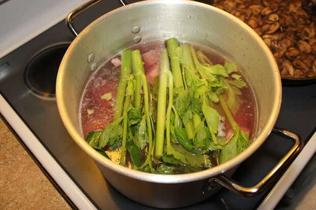 Para hacer el caldo, cocinar varios huesos de tuétano (12-16) en cuartos de 2-3 agua con alguna cebolla, apio y zanahoria para aproximadamente una hora.