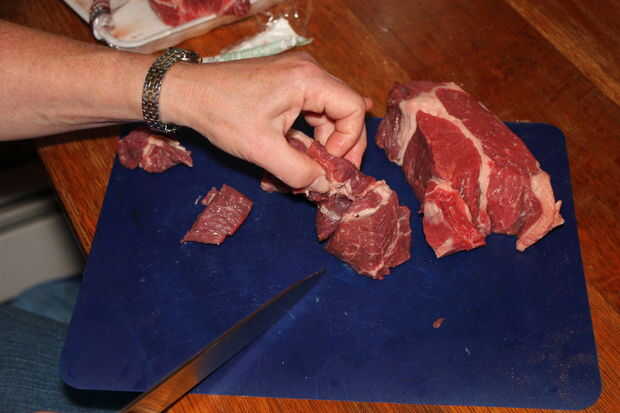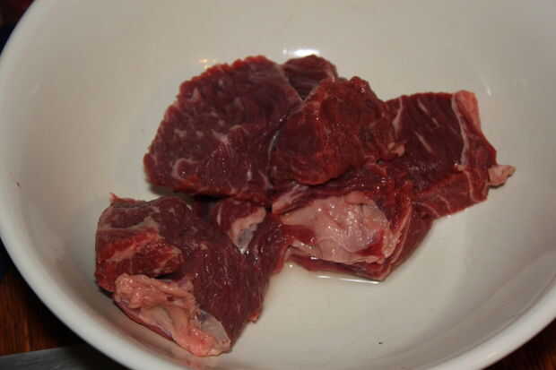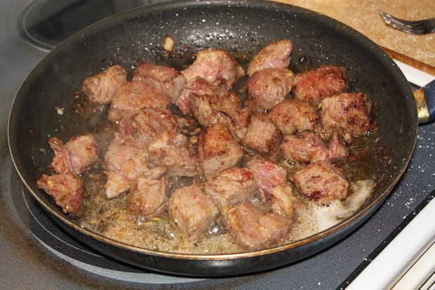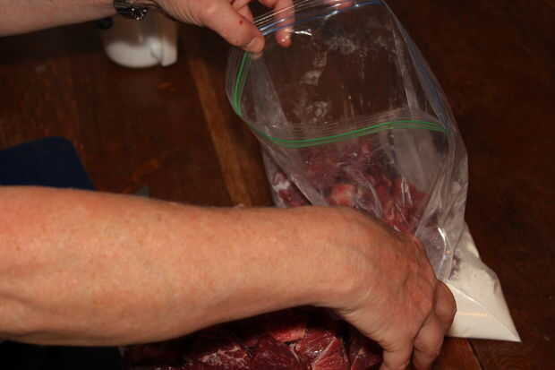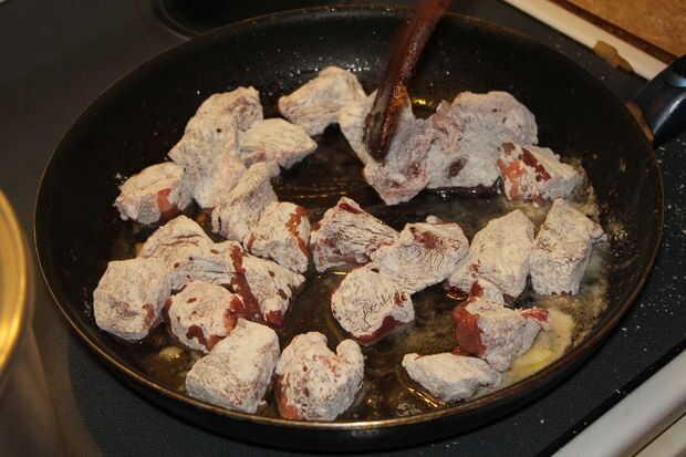 Dragar la carne guisada en harina que tiene añadido de pimienta negra molida.