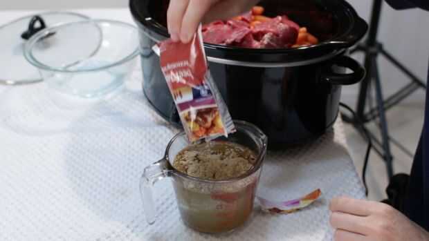 Mayoría de los supermercados tiene una zona de mezcla de especias, con todo tipo de ready-mixes. Ellos son generalmente absolutamente un precio razonable. Mina el costo algo así como $0,69. Vamos a tomar nuestra mezcla y agregue dos tazas de agua y revuelva. Luego viértalo sobre los ingredientes. Si no puede encontrar una mezcla de guiso de carne de res en su tienda o en línea, seguir adelante y utilizar caldo de res, o algo similar.
