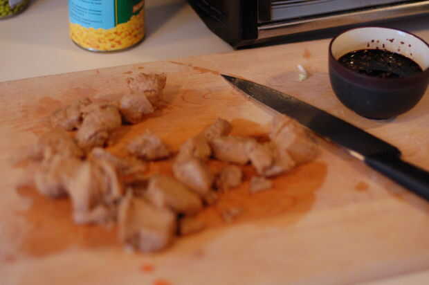Mientras el guiso se cocina cortar el seitán trozos más pequeños.