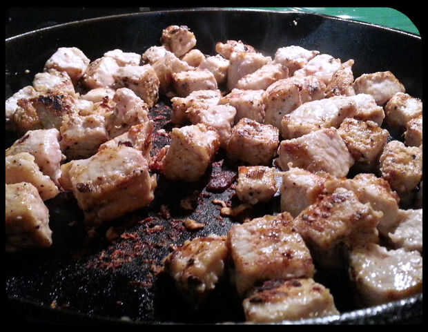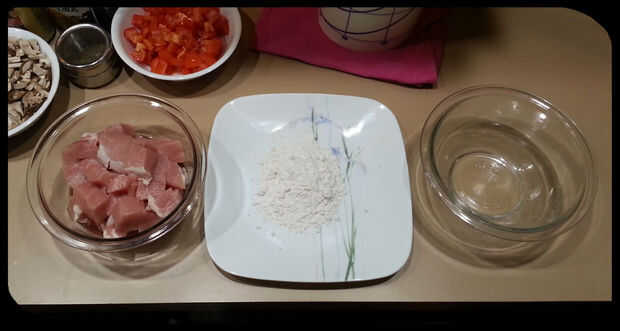Dragar los cubos de cerdo por harina y brown en la sartén. Una vez doradas, añadir carne de cerdo a la olla. Precalentar el horno a 350 grados Fahrenheit.