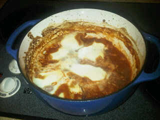 En una olla calentar el aceite a prueba de horno. Agregar la cebolla y y cocinar hasta que la cebolla esté suave. Añadir ajo, chiles, frijoles negros y comino y revolver hasta que especias se combinan bien. Añadir toda lata de tomates en cuadritos y poner a hervir. Dejar cocer a fuego lento unos 15 minutos hasta que el guiso se convierte un poco grueso. Sazonar con sal y pimienta al gusto. Apagar el fuego y añadir rociar 1 taza de queso mexicano. Huevos uno en un momento y lugar de la grieta sobre salsa. Trabajar rápidamente como huevos comienzan a cocinar en cuanto tocan el líquido caliente. Plato todo lugar descubierto en un horno a 350 grados y deje para cocinar durante unos 8 minutos hasta que apenas se cocinan huevos pero las yemas son todavía un poco suaves.