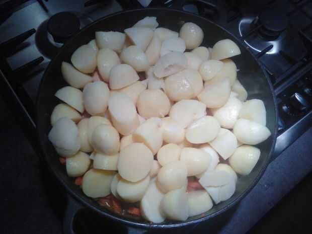Cortar las patatas en cubos y el lugar que encima de todo también añadir un poco de agua hasta que las papas están en el agua (no demasiado) y dejar cocer a fuego lento unos 20 minutos revuelve ocasionalmente.
