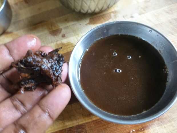 Remoje el tamarindo en una taza de agua tibia. En pocos minutos se encuentra la mayor parte del tamarindo se disuelve en agua. Ahora puede separar la pasta y guardarla a un lado.