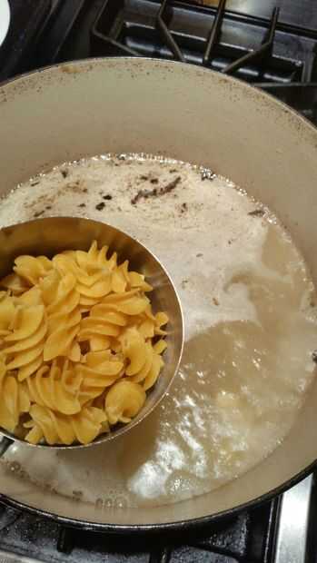 Agregue 1 cucharadita de sal kosher y una vez hirviendo agregar la pasta y cocinar de 7 a 9 minutos o siga las instrucciones de la pasta hasta que esté al dente. Una vez que la pasta es listo retirar y reservar.