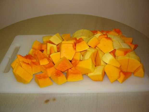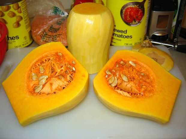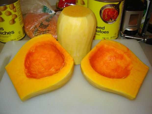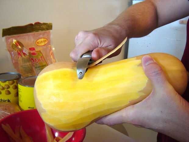 Friegue la calabaza, a continuación, pelar con un pelador de verduras.  Corte los extremos superior e inferior.  Cortar la base de la calabaza, y luego dividir la base por la mitad para exponer el núcleo de las semillas.  Use una cuchara grande de metal para raspe las semillas y las entrañas.  Considere las semillas de la hornada como aperitivo.  Trocear la calabaza en cubos de 1 pulgada.