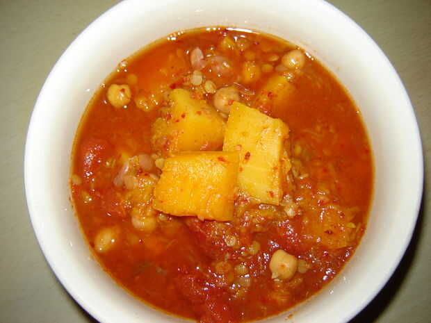 Guiso de garbanzos berenjenas - esta receta es deliciosa, nutritiva, vegano y libre de gluten! Es muy fácil de hacer y con arroz es una comida de relleno. Necesitarás los siguientes ingredientes:1 berenjena (cortada)1 tomate grande (quite la piel tom