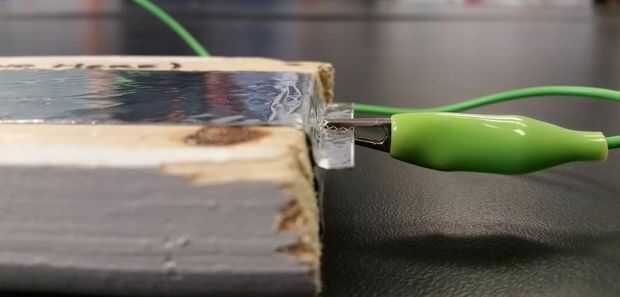 ¿Después de cada cable es seguro y hasta sus estándares, coloque un trozo de cinta de metal (o papel de aluminio) para el espacio abierto en la duela (Recuerde? El área lo dejó pelado en el paso uno?) y deja una pequeña aleta en cualquier borde de la tabla para la pinza de cocodrilo conectar a.