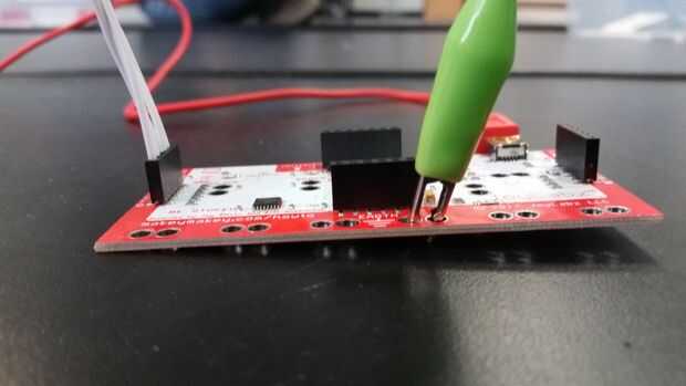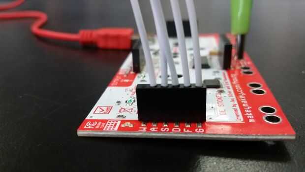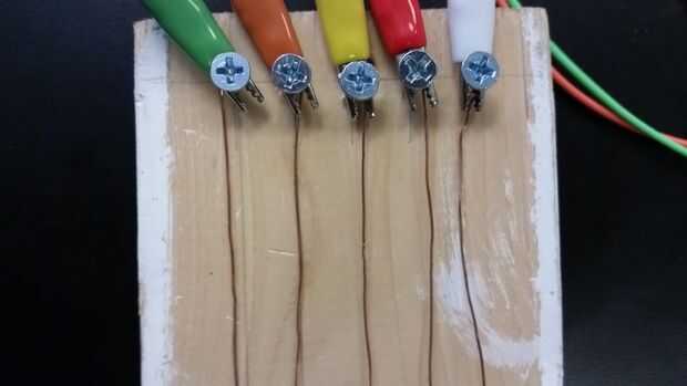Tiempo para romper tu kit MakeyMakey! Tomar los seis cables y conecte cinco a los tornillos (uno para cada tornillo) y luego conecte la sexta a la aleta que ha creado en la cinta de metal. Luego agarrar cinco de los seis siempre blancos hilos de su equipo y deslice en la A, S, D, F, puertos de G en la parte posterior del chip MakeyMakey. Conectar los cables de los tornillos a las zonas expuestas de los cables blancos, verificar que cada cuerda de la guitarra corresponde a cada puerto en el MakeyMakey. Por último, conecte el cable conectado a la cinta de metal de aluminio a cualquier cocodrilo pre-construidos clip puertos etiquetados bajo la sección "Tierra".
