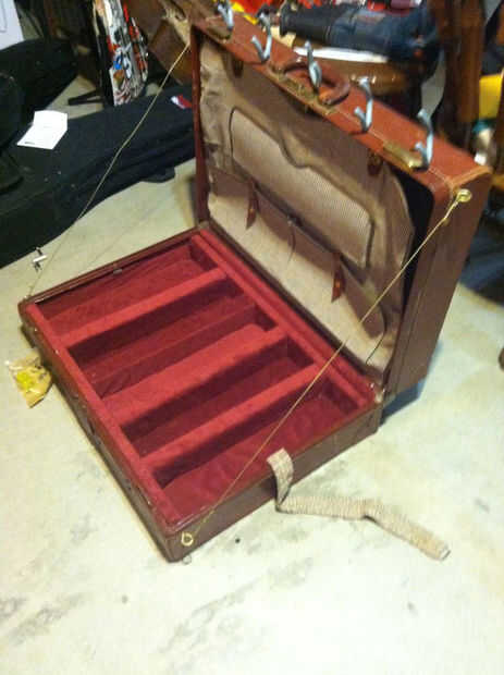 Para mantener la tapa de la caja en un ángulo de 90 grados, mientras que también siendo capaces de soportar el peso de 5 instrumentos, sujeta con dos 1/16 '' roscadas cables metálicos (100 lb test) y ganchos de madera tornillo de ojo. El extremo de los cables se enrollado y prensado con 1/16 '' plegadores. Los plegadores fueron conectados al cable a rosca con un par de apretones y fuerza bruta. Te recomiendo cortar el cable con una dremel y discos de corte metal puesto que este cable es muy resistente al corte - cortadores de perno y cortadores de alambre normal no funcionan tan bien.