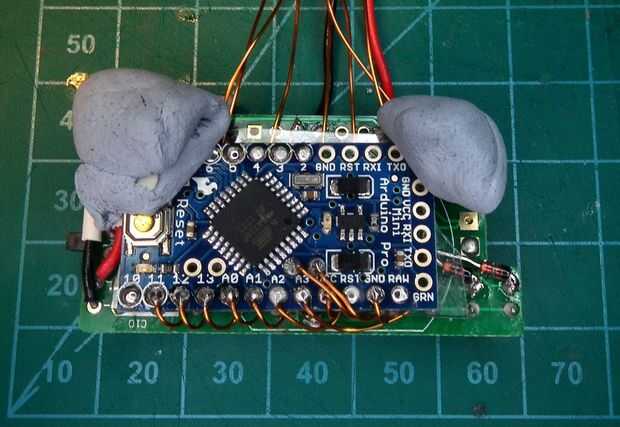 Para aislar el Arduino desde el circuito sintonizador de guitarra, utilicé una pieza de plástico de algunos embalajes y mantiene en su lugar con una almohadilla de espuma pegajosa.