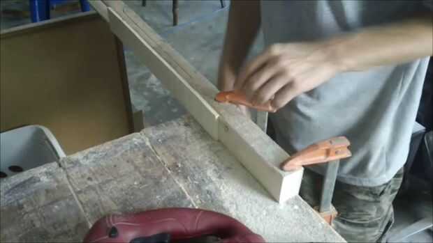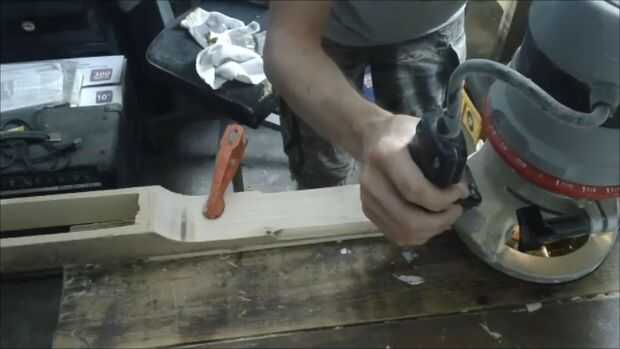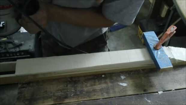 Baja por el cuello de la guitarra de la abrazadera hacia abajo y utiliza un router para poner un borde curvado a ambos lados de la parte posterior del cuello. Arena hacia abajo tan lisa como sea posible. Dale la vuelta y poner un poco directamente en el router. La parte inferior del cuello es de 57,5 mm y la parte superior es de 43 mm. Para dibujar una línea que conecta estas dos medidas, y luego usar el router para pasar ligeramente sobre él hasta pulirla hasta esa línea.