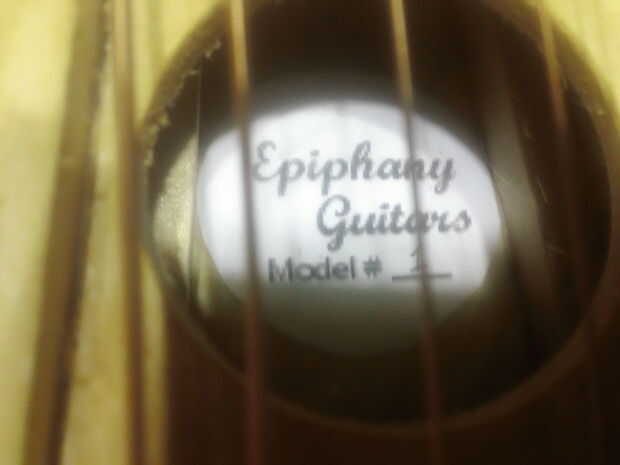 Antes de colocar las cuerdas, decidí utilizar una perforadora de papel, a continuación, utilice un marcador permanente para marcar mis trastes donde normalmente están marcados en las guitarras. Haz marcados los trastes 3,5,7,9,12,15,17,19. Luego imprimí etiqueta un poco "guitarras de Epifanía" para pegar dentro de la boca, para darle ese aspecto "oficial". Luego yo había encadenado para arriba, templó para arriba, luego juega mi corazón.