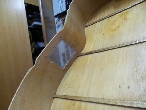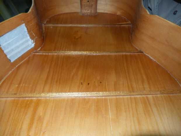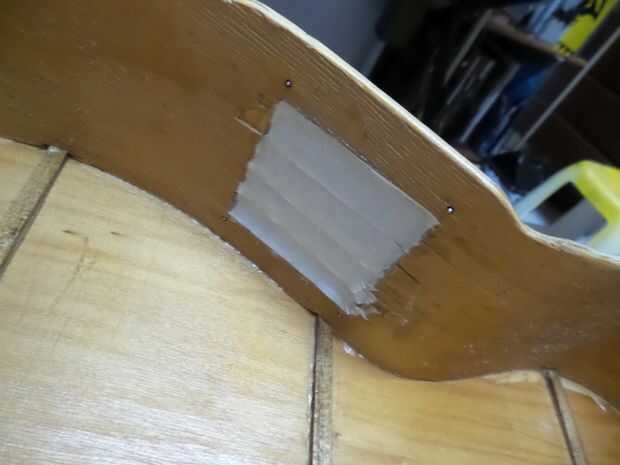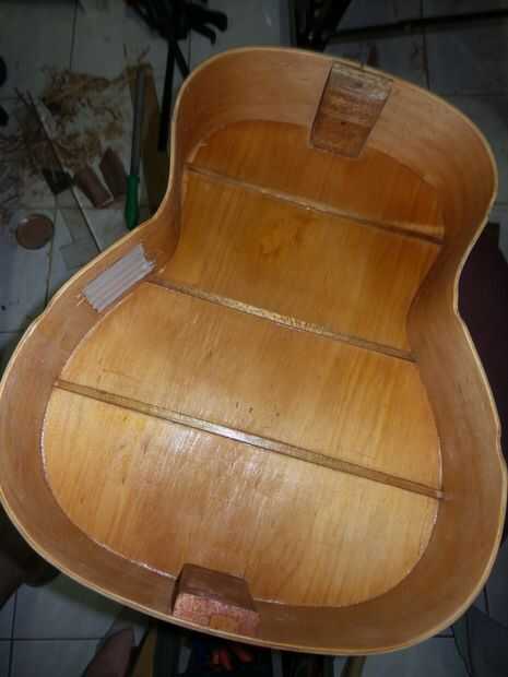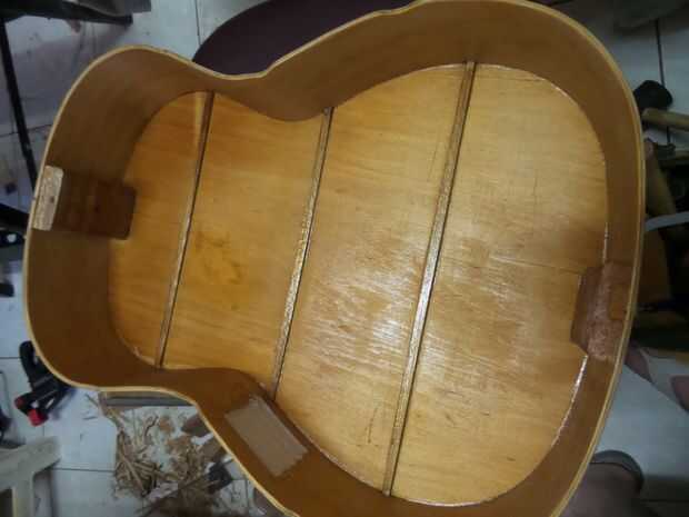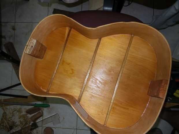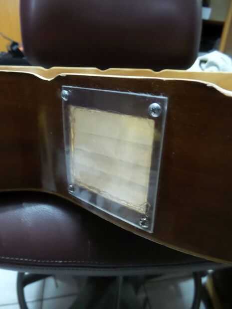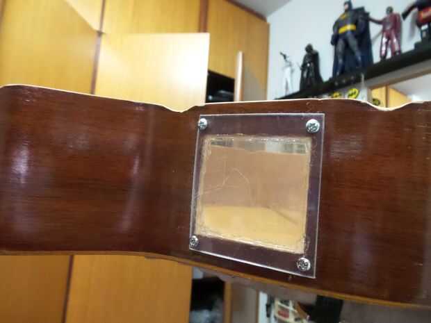 Depois de lixar bem, apliquei algumas demãos de verniz incolor em aerosol. O tempo entre como demãos foi de 10 minutos. Realçou realmente un cor da madeira e ficou com um aspecto excelente! No meu caso, UE havia instalado um preamplificador no lateral deixou esta feia janela de violão o. A solução foi instalar uma peça de acrílico no local para servir de tampa e dar uma aparência melhor! Para aplicar o verniz UE cobri una peça com fita adesiva.
