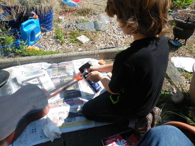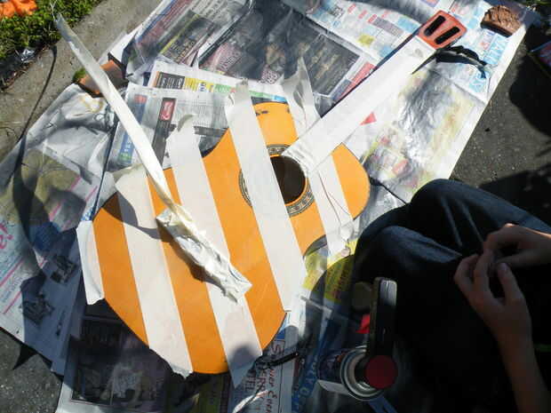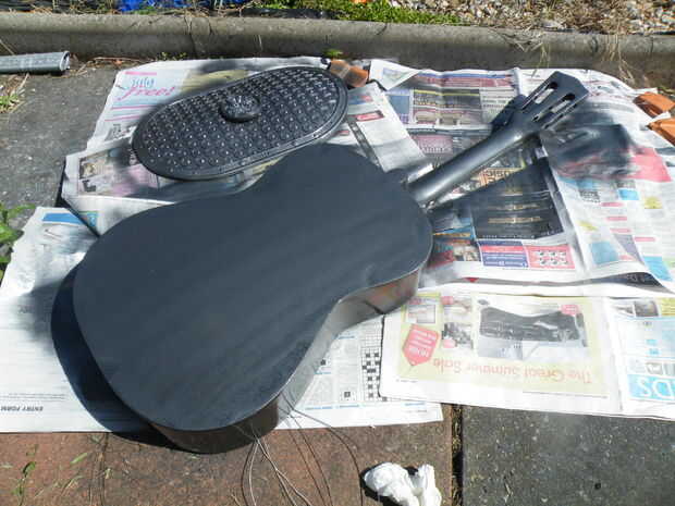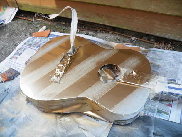 Decidimos hacer la parte de atrás y los lados del cuerpo y el cuello, en "metal martillado". Pone la guitarra en su frente y dio las partes expuestas, dos capas, con entre el tiempo de secado.