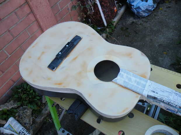 Si utiliza una lijadora eléctrica en tu guitarra, asegúrese de que sujete la guitarra firmemente para detenerla girar lejos. Mi barato knock-off de un compañero resultó ideal. Terminamos de esquinas torpes a mano, envoltorio de papel de lija alrededor de un trozo de madera.