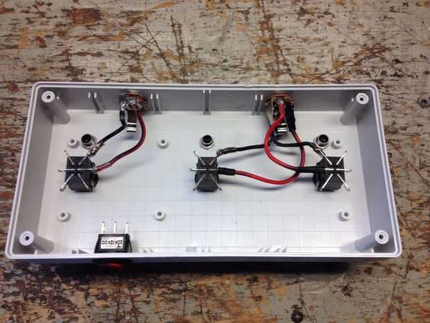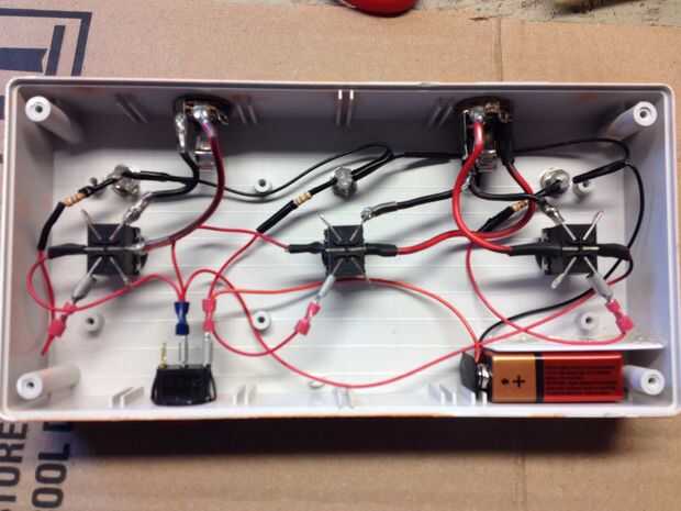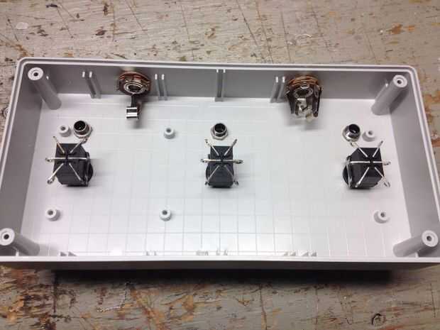 Antes de comenzar el cableado, necesita perforar el envase para adaptarse a todo el hardware. Necesita perforar agujeros para lo 1/4" entrada de jack, el LED, el footswitche(s) y el interruptor de la batería. Como su hardware puede diferir de la mía, no voy a dar la dimensión de los agujeros. Si tienes una pinza, utilizarlo para encontrar el diámetro que del agujero debe ser. Siempre comienzan con un pequeño agujero y poco a poco hacer su camino hasta la dimensión de derecho o de lo contrario usted podría romper la caja de plástico. Utilice una lima de metal para suavizar los bordes.