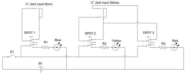 En la parte inferior del esquema, tienes el soporte de la batería de 9v. S1 es el interruptor SPST para la batería de 12v. DPDT1, DPDT2 y DPDT3 son los conmutadores de pedal. R1, R2 y R3 son las resistencias. Tenes los LED con su color escrito sobre él. Ambas entradas de jack 1/4 están en la parte superior del esquema.