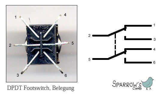 Para el interruptor (S1), debe tener 2 o 3 clavijas en él, el tercer pin (generalmente un alfiler de oro) es a la luz del LED en el interruptor pero no necesitamos esta función. He encontrado un dibujo poco aseado para mostrarle donde cada pins de un interruptor DPDT se encuentran en el esquema. También, si le sucede que tiene una entrada de jack de 1/4 mono con más de 2 pines o un equipo estéreo con más de 3 pines, tienes una entrada con un interruptor integrado que puede usarse para determinar si hay un cable conectado en él. Una vez más, para determinar que pines es que, utilizar un conjunto multímetro en el modo de continuidad y toque el pin de misterio con otra parte de la entrada (en el ejemplo, tocando uno de los pines y la parte de la punta de la entrada). La razón por qué he elegido el pequeño 12v SPST cambiar entradas de 1/4 con un interruptor integrado es porque quiero que mi pedal para trabajar con amplificador muy diferente como sea posible. Así si un día necesito sólo conectar un cable, no quiero el pedal a esperando el otro cable a activarse. Con este dicho, se podría hacer con el interruptor integrado de entradas de jack pero el cableado sería más complicado que simplemente lanzar un simple interruptor en el circuito... También, por alguna razón, podría desea apagar los LEDs mientras que todavía usa el pedal.