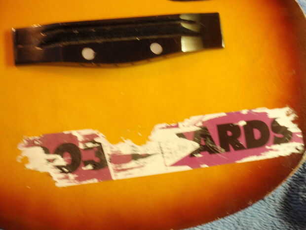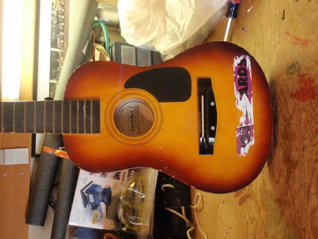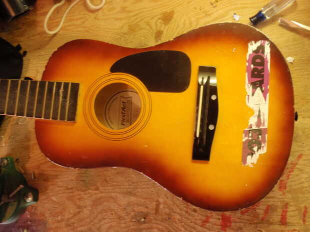 Guitarra es una guitarra vieja de primer acto, específicamente el "primer acto descubrimiento." Tiene muchos golpes y abolladuras en él. Una guitarra barata general. Tuvo también dos grandes pegatinas en el frente, pero de manera gratuita, qué diablos.