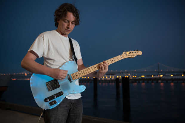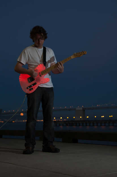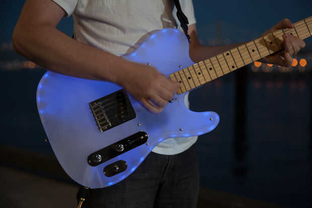 Si bien hay un par de otras guitarras que brillan intensamente por ahí, éste por lo general distingue sí mismo. Para empezar, es helado para difundir la luz de los LEDs. Esto significa que el cuerpo entero brilla en lugar de ser sólo iluminada del borde-, y también se puede ver durante el día. La otra característica única de esta guitarra es que responde a la música está siendo reproducida. El brillo se ajusta por el volumen y el color es controlado por la duración que se está reproduciendo. Por lo tanto, la más dura roca, los colores más verás.