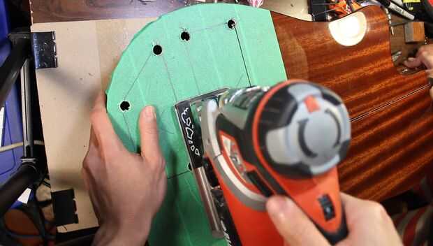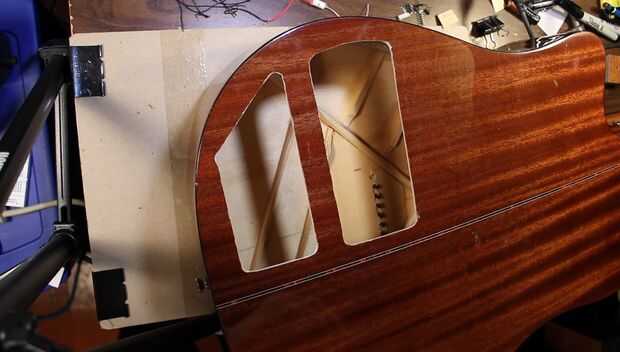 Utilizar una hoja fina de cortar abajo en una sierra de calar, vamos a cortar abrir dos ventanas en la parte posterior de la guitarra (evitando la espalda apoya que se ejecuta a través de la guitarra, si cualquier).