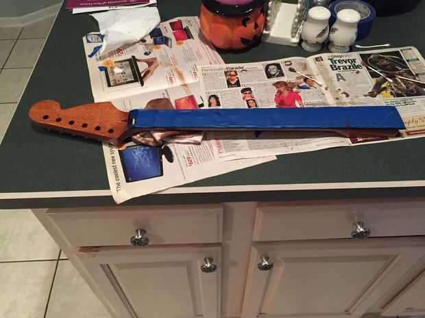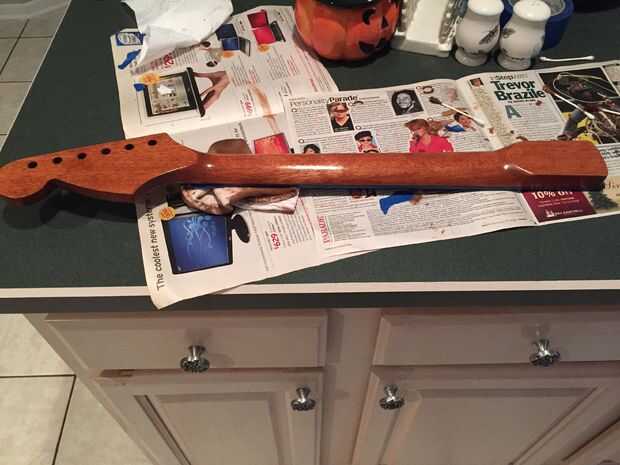 Utilice cinta de pintor para cubrir algo que no desea que la capa de mancha. Comenzar a aplicar el tinte con un pincel, cubriendo toda el área completamente y después permitiendo que se seque antes de aplicar el poliuretano. Para mi guitarra, he utilizado 1 capa de mancha y 3 capas de poliuretano, dando a la madera 1 día completo para secar entre capa y capa. En la actualidad el cuello está completamente terminado y voy a ser la coloración del cuerpo de la guitarra pronto.