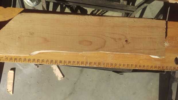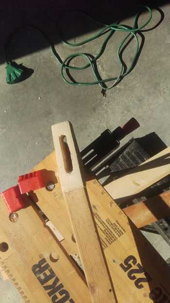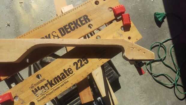 Aquí está el 2 x 4 después el cuello y la cabeza corta. Perforé tres agujeros en la cabeza (lado) para los pernos de ojo (sintonizadores) que se añadirán más tarde.