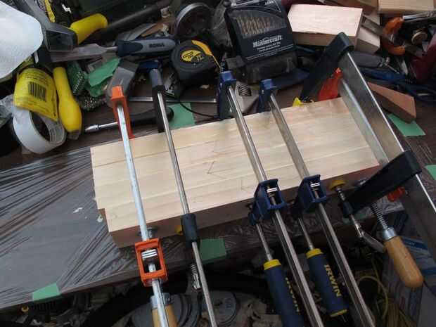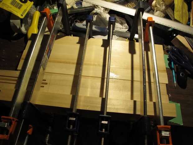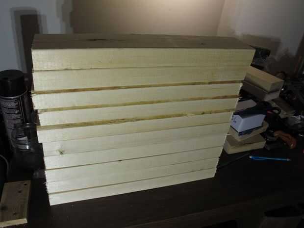 Tomó el otro 2x4s y había les había picado para arriba en secciones más cortas y había pegado en las losas. Corte las losas del 3,5" que empezaron, hasta un poco más 2" cerca el espesor final del cuerpo. Lo hice de esta manera sólo por estética. Usted podría ahorrar algún tiempo solo usando un 2 x 8 o algo, y haciendo un poco más delgado para que coincida con su cuerpo.