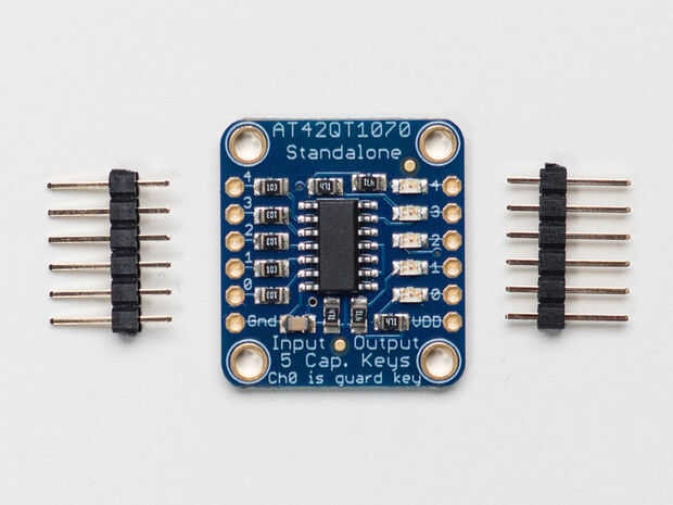 - Utilizamos un sensor de toque de capacitancia (5cap) 5 AT42QT1070 para determinar qué notas para reproducirse. Cada dedo de la mano izquierda denota un determinado acorde o nota. Como una guitarra requiere dedos en orientaciones específicas para jugar cables, usaremos la 5cap sentido para determinar cuándo cada combinación de dedo-nota se reproducirá sólo tocándolos con el dedo pulgar! (en la misma mano)