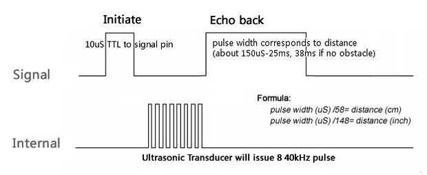 Eco - el pulso de retorno de TRIG se escucha, y el tiempo que tarda la liberación del pulso el pulso vuelve se llama "echo hacia atrás". Sabiendo la velocidad del sonido (en promedio), la distancia de un objeto puede calcularse dividiendo la anchura del impulso de retroceso eco 58 (para centímetros) o 148 (de pulgadas).
