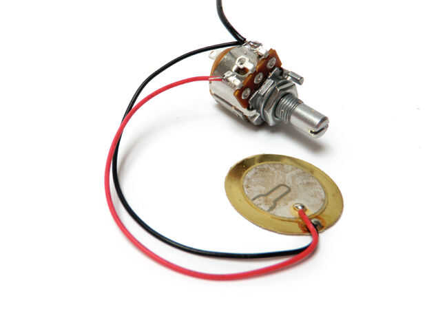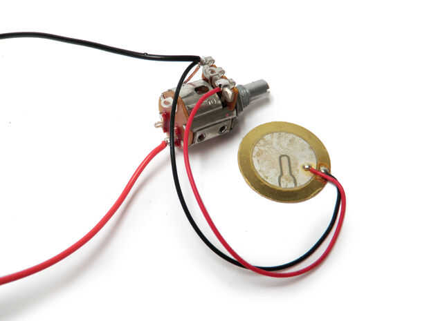El cable rojo desde el disco piezo a la patilla derecha del potenciómetro de alambre.