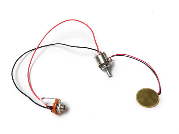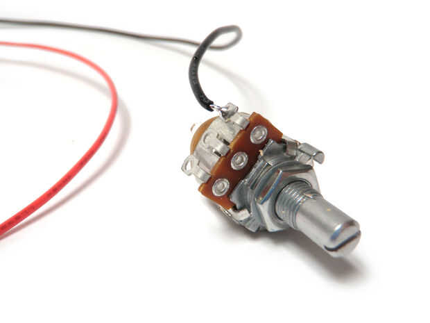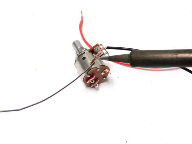 Finalmente, el cable el pasador central del lado del potenciómetro, al pasador más cercano (frente) en la parte inferior del potenciómetro. Cable el cable rojo del conector de sonido al más (posterior) perno del potenciómetro de.
