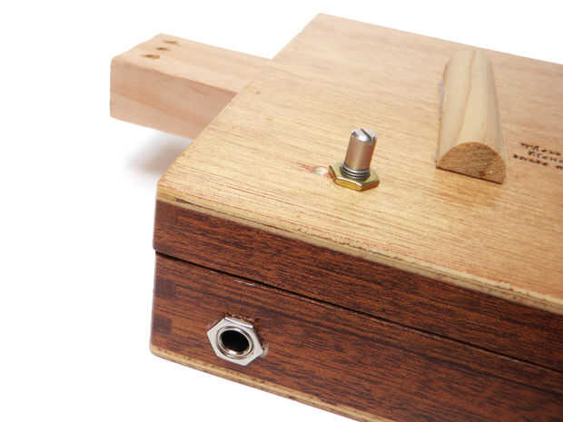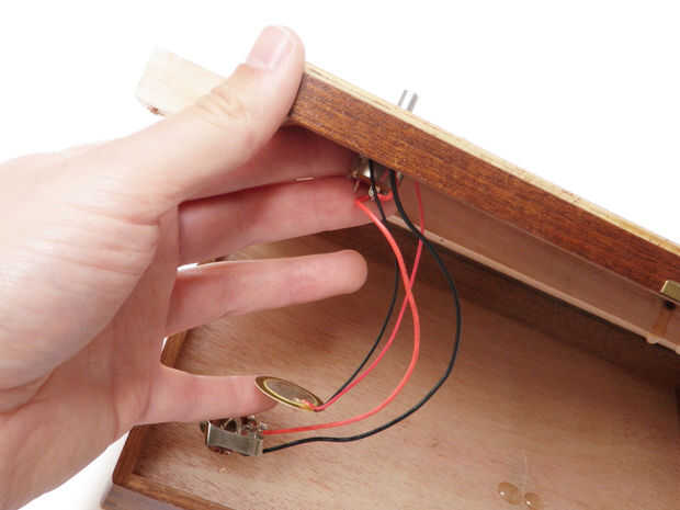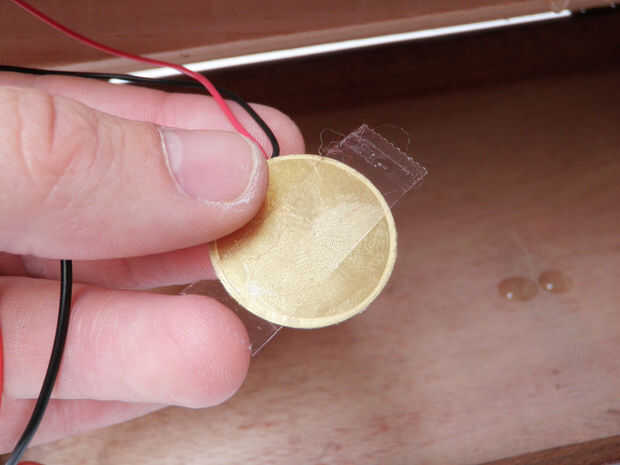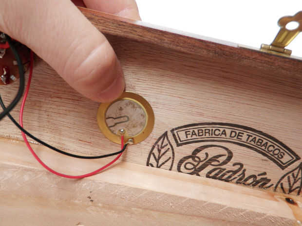 Por último, usando cinta de dos caras estándar (preferible), coloque el lado plano del elemento piezoeléctrico en la parte inferior de la parte delantera de la guitarra de la caja de cigarro. Intentar colocar este cerca la sección 3" de media vuelta que se pega encima de.