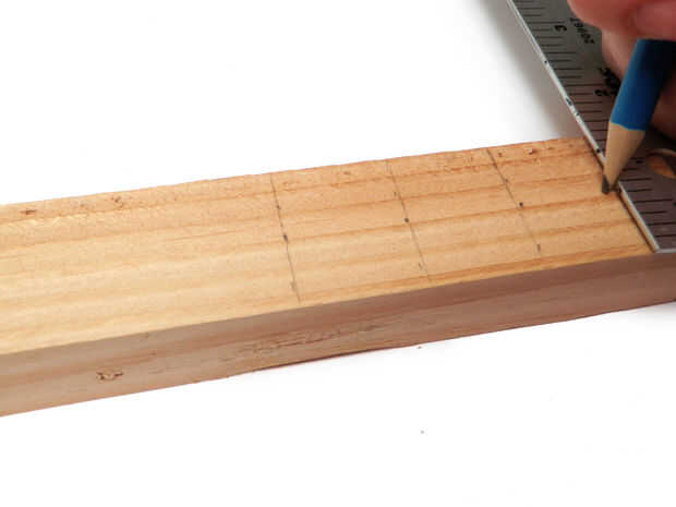 En la tercera línea, hacer una marca de 3/8" desde el borde izquierdo y 3/4" de ambos bordes.