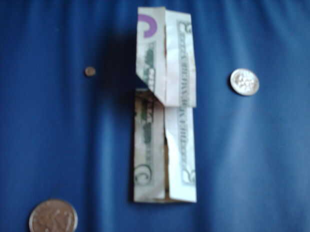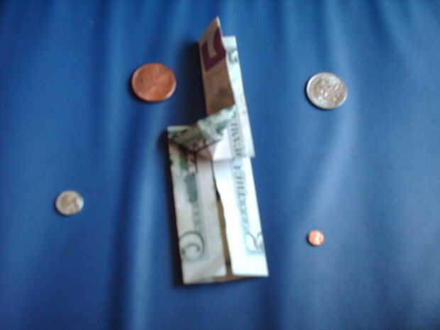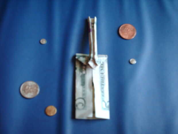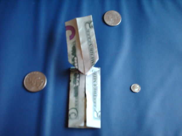 retrato de dólar. Mejor hecho en una factura de $1 o $100 donde la imagen está más centrada. En la parte posterior, la parte superior se pliega en una 90 grados a lo largo del pliegue. La parte inferior se dobla formando un ligero ángulo como se mues