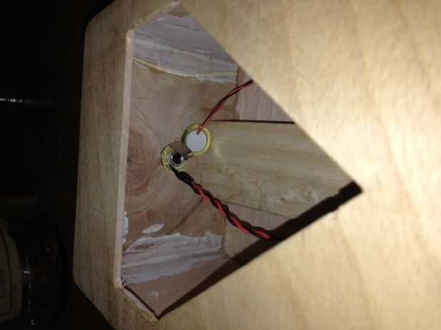 Cortar una forma de respaldo con el rompecabezas que permite el acceso para la recolección. Tengo un piezo de eBay para 3 libras. Perfore un orificio adecuado dentro para el gato y el otro extremo del palillo en la parte inferior del puente.