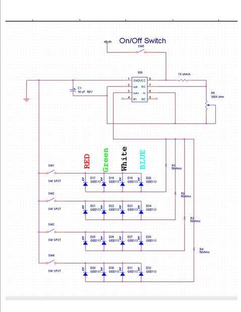 Aquí es un esquema rápido del diseño.  Bastante básico diseño de Temporizador 555, que se puede cambiar para obtener resultados diferentes.  Junté un tablero pequeño cludge con cada color de led en él.  Así que hay cuatro tableros todos juntos para un total de 16 LEDs.