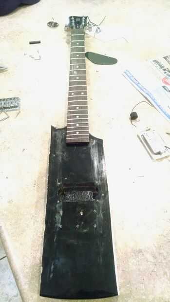 Empezó con un acto barato de primera guitarra. Primer paso es desmontar la guitarra de preparación para el corte, lijado, pintura, etc., corte los dos lados para darle forma de rectángulo. es el órgano principal que dará soporte a la tensión de la cuerda.