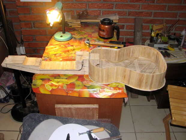 hice el cuello haciendo una forma cuadrada y pegar cerca de 900 palos juntos para formar un bloque gigante... I luego cortar, lijar, presentado y había formado el cuello... Encamina hacia fuera el canal para el alma... Utilicé las tuercas en T insertadas lanzó un orificio perforado y lo cuadrado para arriba en la base del cuello...