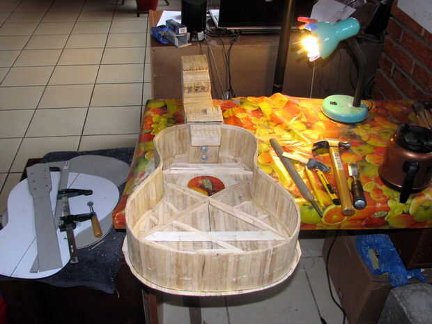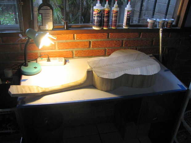 Pegado al ras de los bordes posterior y dirigido... Añadir refuerzo posterior normal con palos... Empezando a parecerse a una guitarra