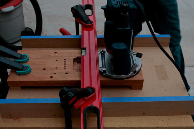 Utilizar un router de gran medida 45 bit que tiene un 7/8" corte para empezar a los cartabones de la parte delantera de la forma. Ajustar la altura del router para que el extremo ancho de la broca quede al ras con la tabla. Es un poco incómodo de espera tanto así le dan algunas pistas de práctica antes de cortarlo.