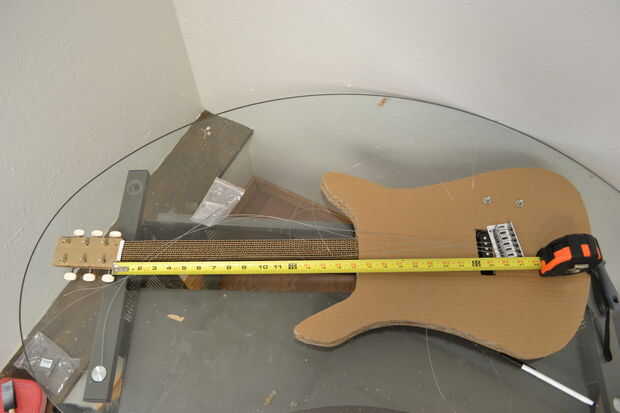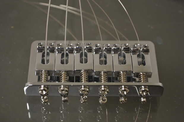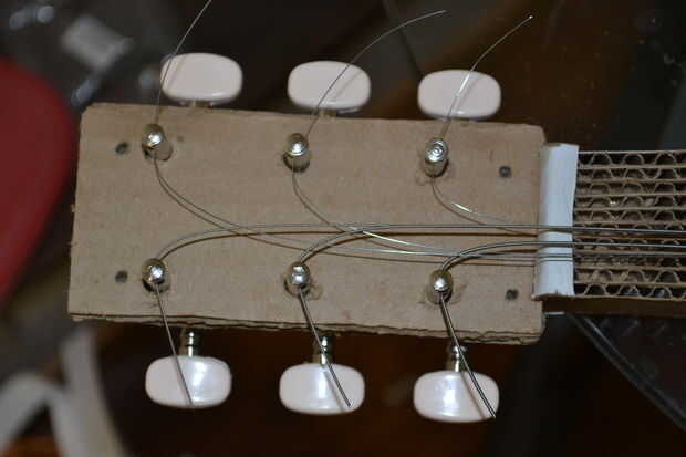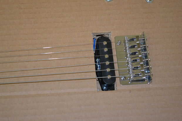 Con el puente asegurado ahora viene la verdadera prueba. Empezar por recortar las cuerdas a unos 1.5"- 2" más allá de su respectivo peg. Alimentación de cada cadena, desde el centro de la contrapunta, a través de sus clavijas, girando las clavijas lo suficiente como para que la cuerda no deslice hacia fuera. Ahora comienzan poco a poco aplicar tensión a las cuerdas, a partir de media dos y trabajando hacia fuera y hacia adelante y hacia atrás. No apriete en secuencia, trabajo a la afinación correcta. Como aplicar la tensión de ver los puntos débiles: tornillos que sujetan el puente, la unión entre el cuello y el cuerpo y mi defecto, la junta entre el cuello y la cabeza (en realidad fue totalmente culpa de cabezal pero más sobre esto más adelante). Para ser honesto me puse gafas por esta parte como he visto a un cello cuerdas fallan catastróficamente y valoro mi percepción de profundidad. Te recomiendo que algunos usas demasiado. Cuando las cuerdas parecen ser llegar a la tensión correcta es hora de romper el sintonizador. Afinada la guitarra mira la camioneta en relación a las cuerdas. Usted desea que estar cerca pero no lo suficientemente cerca que podía tocar. Ajustar su altura con los dos tornillos que la sujetan en, los resortes deben mantenerlo apretado a las cabezas de los tornillos.