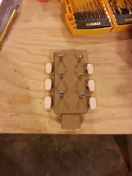 Cabezas de la máquina: Seleccione un tamaño de broca que las clavijas se deslice a través del cabezal. Para mí era 1/4". Taladre los agujeros para las seis clavijas en el clavijero. Si se agrupan en una placa entonces asegúrese de que usted mida y marque las distancias del centro. Las clavijas se fijase en ligero ángulo, más ancho en la base, para que las cuerdas se espaciarán uniformemente cuando vienen a través de la tuerca. Para terminar, colocar las placas en la parte posterior del cabezal utilizando cualquier métodos proporciona la cabeza, generalmente los tornillos.