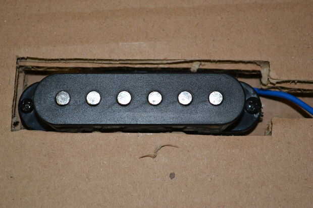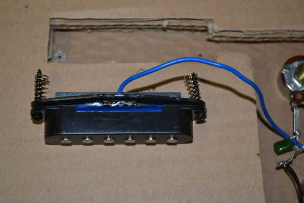 Recolección: mi camioneta vino con dos tornillos y dos muelles cónicos. Mediante la colocación de los muelles por debajo de los orificios en el cuerpo de la recolección puede ajustar la distancia entre la pastilla y las cuerdas. Simplemente marque las ubicaciones de dos agujeros a través de los agujeros de paso en la camioneta, lugar los resortes sobre los agujeros, la camioneta sobre los resortes y apriete los tornillos. Ajustaremos la altura un poco más adelante.