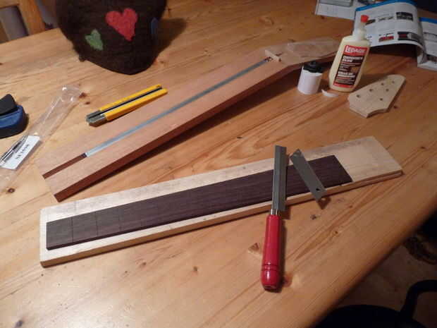 Corte el tablero del dedo a la dimensión derecha (un poco más grande ya que nos va arena más tarde). Utilizando una lámina muy fina (fret saw), cortar unas ranuras en el tablero del traste en el lugar correcto. Las distancias dependen del tamaño del cuello y pueden ser encontradas en línea. Usé unos provistos con el plan.