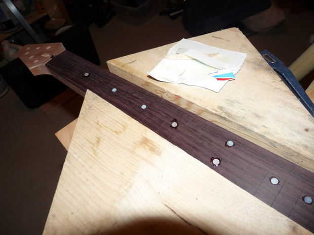 El siguiente paso es las incrustaciones. He utilizado a la madre de perla 1/4" discos. Utilizando un enrutador de penetración, puede perforar cavidades redondas que tienen una profundidad ligeramente menos de su grueso de incrustaciones.